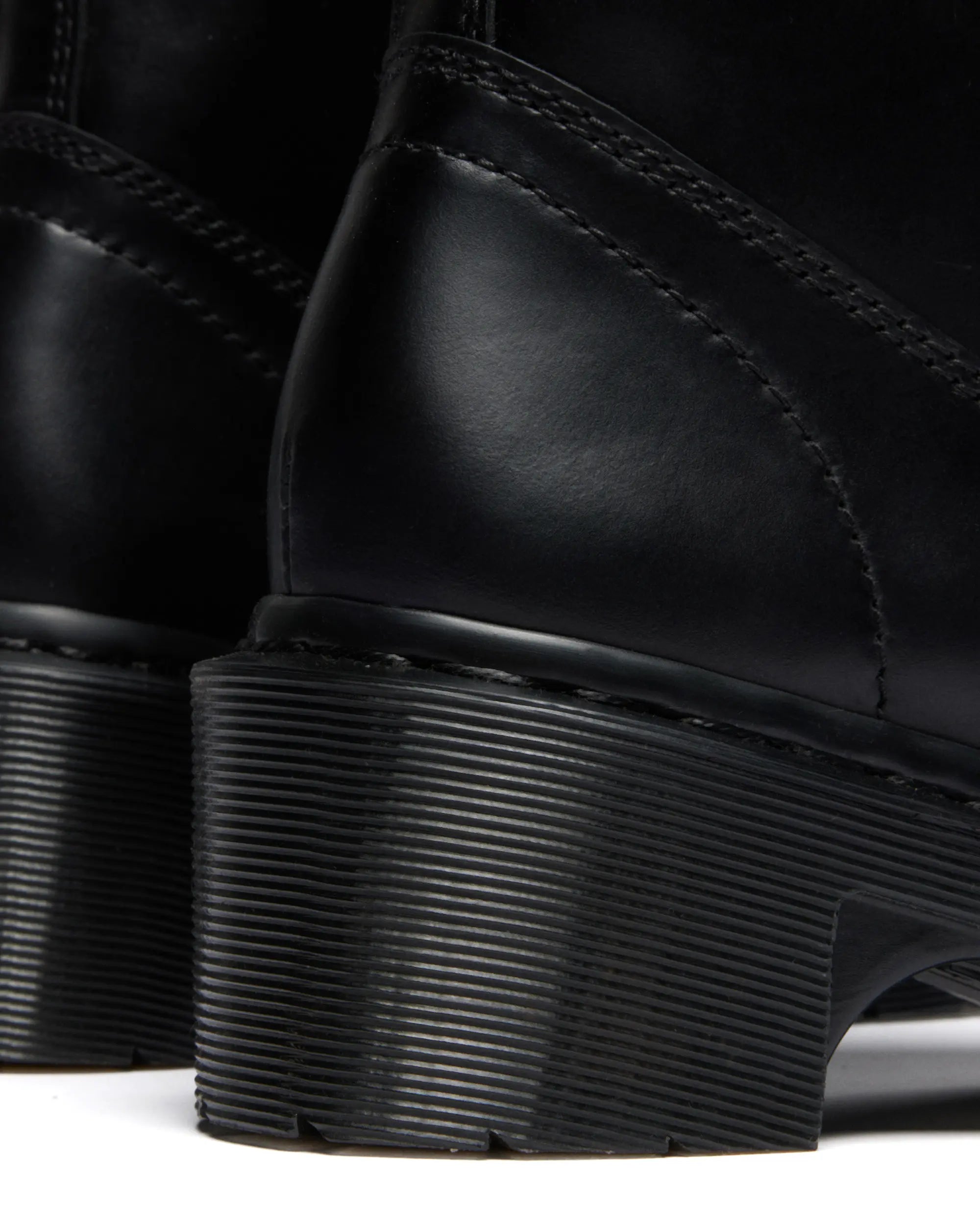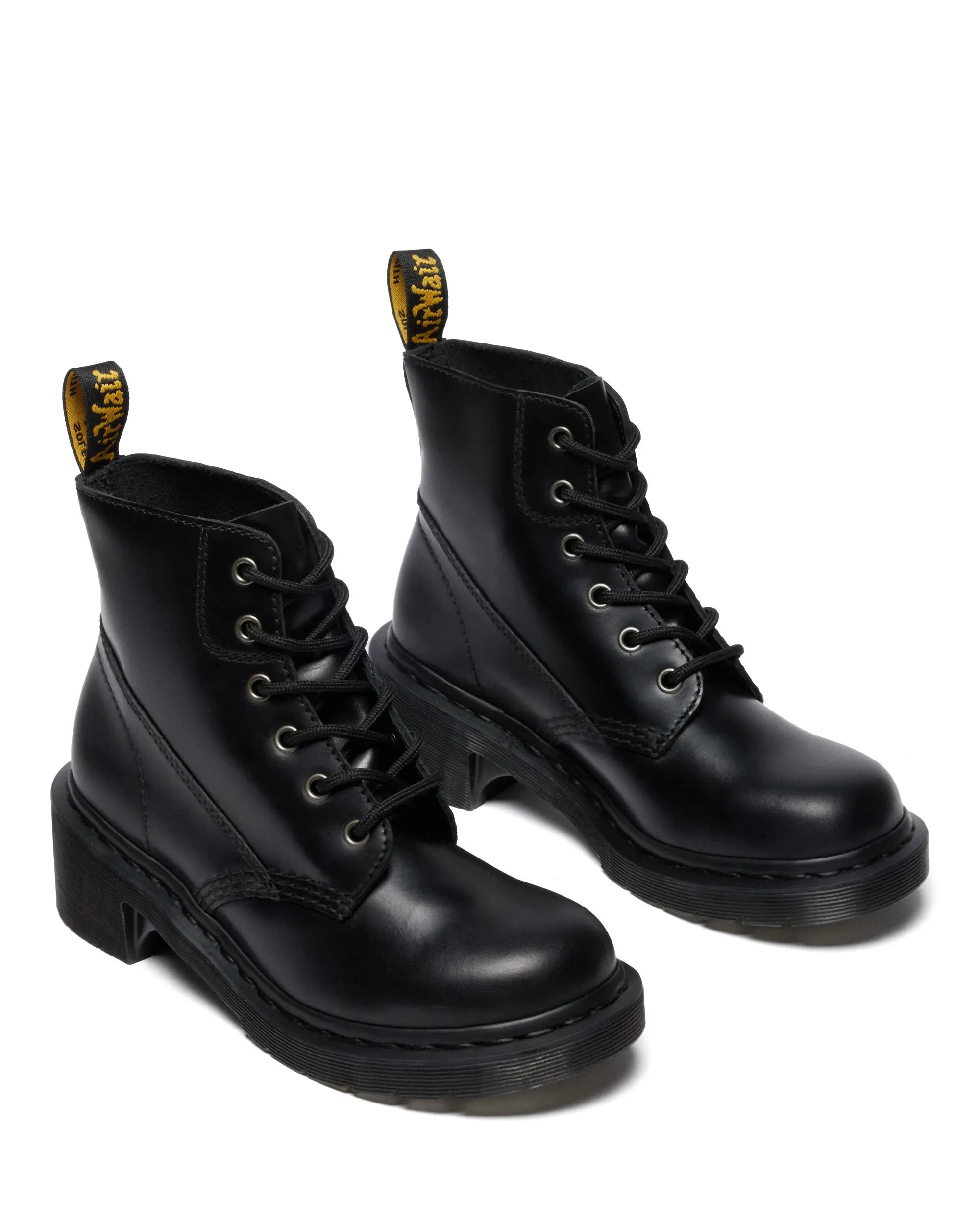 Die Silhouette orientiert sich an den ikonischen Dr. Martens Boots, wird aber durch den Blockabsatz und die klare Linienführung urban interpretiert. Die typische Goodyear-Rahmennaht, die geriffelte Außensohle und die gelb-schwarze Fersenschlaufe machen sofort klar: ein echter Doc.