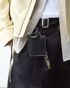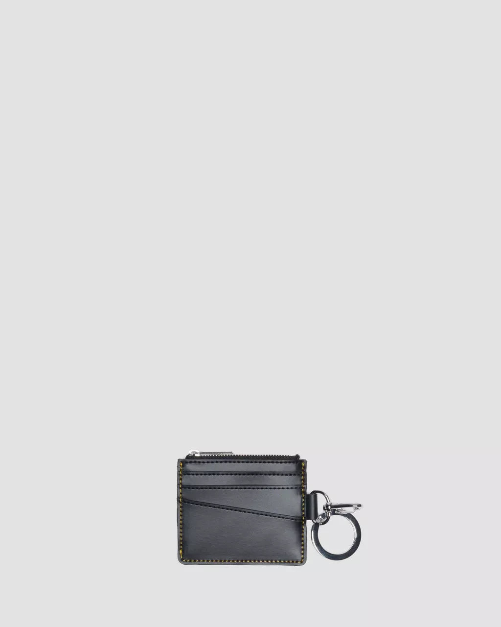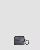 Designt für Funktionalität und aufgrund hoher Nachfrage zurück. Kompakter Kartenhalter mit durchdachtem Aufbau: drei Kartenfächer auf der Vorderseite, Münzfach mit Reißverschluss sowie ein Schlüsselanhänger mit Schnalle zur Befestigung. Gefertigt aus schwarzem Kiev-Leder mit geprägtem DM’s Logo auf der Rückseite.