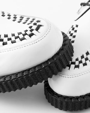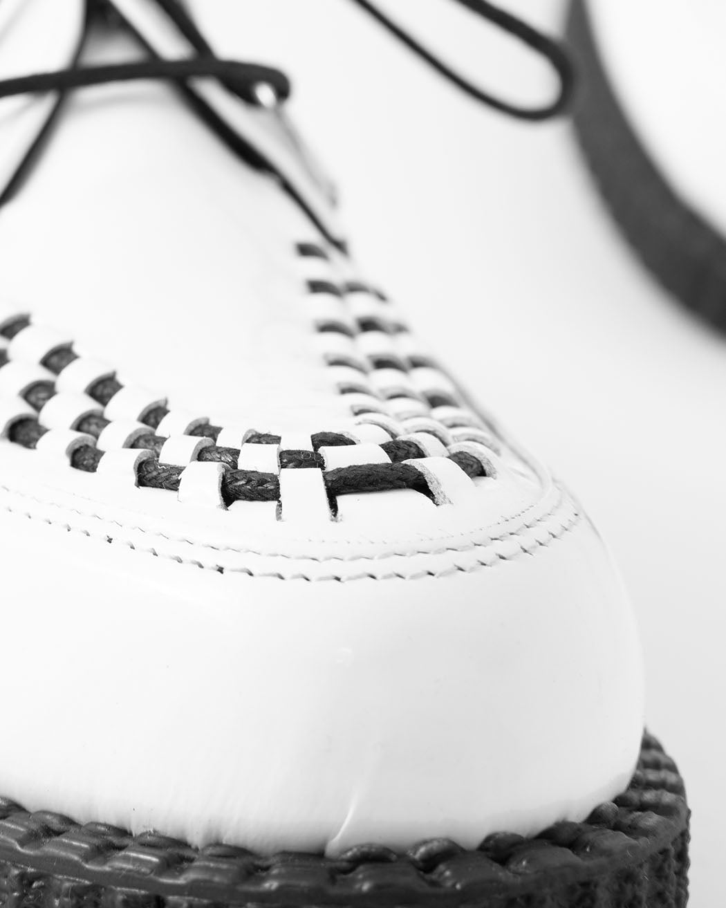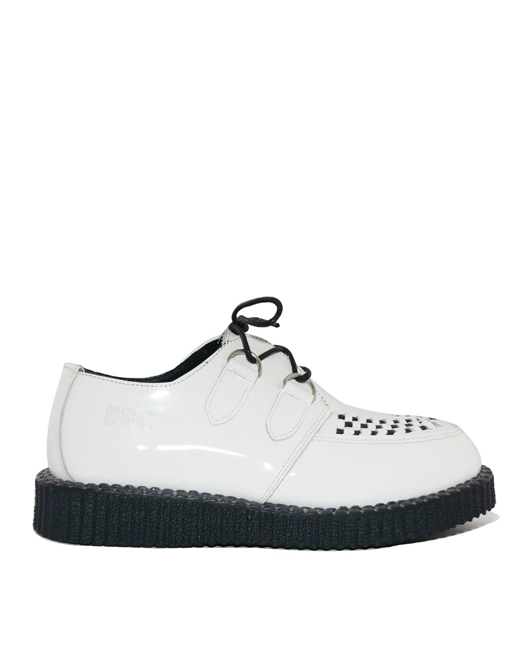 Ein unverwechselbarer Klassiker von BBC! Dieser Creeper ist aus hochglänzendem, weißen Lackleder gefertigt, was mit einem Flechtmuster mit Liebe zum Detail verarbeitet ist. Die Schnürsenkel werden durch die seitlich vernähten silbernen D-Ring Ösen geführt. Die typische Creeper Sohle zeichnet sich durch ihre Leichtigkeit, Bequemlichkeit und geriffelte Plateau Optik aus. Dieser Halbschuh ist ein Unisex Modell.